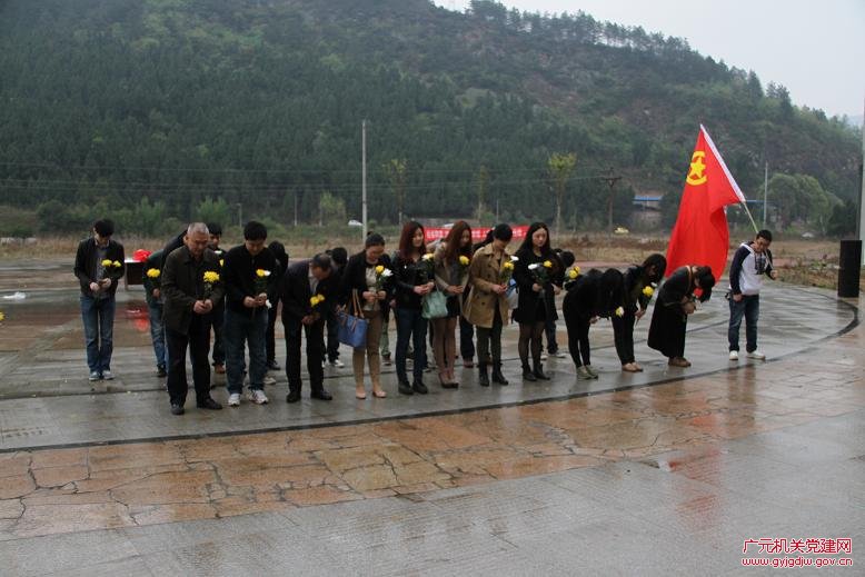 在广元烈士纪念碑前,伴随着庄重肃穆的哀乐,青年团员们向为中国人民革命和共产主义事业而牺牲的广元藉革命先烈默哀三分钟并敬献花篮和寄托哀思的小菊花,以此缅怀革命先烈的丰功伟绩,寄托对革命先烈的无限哀思,颂扬革命先烈的崇高精神。随后,参加活动的全体团员绕纪念碑缓步行进、瞻仰,表达对人民英雄的敬仰和怀念。仪式结束后,邀请纪念馆领导为大家讲解革命烈士的英雄事迹,增强大家对我市近百位为革命烈士丰功伟绩的了解,激励大家为广元的经济和社会建设与发展贡献力量;同时组织青年团员在印有“践行群众路线、缅怀革命先烈、建设美丽广元”的横幅上签名留念。